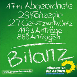 Die Landtagsfraktion von BÜNDNIS 90/DIE GRÜNEN hat eine Bilanz-Broschüre zu ihrer Arbeit in der sich dem Ende entgegen neigenden Legislaturperiode vorgelegt. „Wir haben eine engagierte Oppositionsarbeit geleistet und sind mit unseren Konzepten und Ideen auf den Wechsel vorbereitet. In der Broschüre stellen wir unsere Arbeit in dieser Legislaturperiode vor. Anders als die schwarz-gelbe Landesregierung müssen wir unsere Bilanz nämlich nicht verstecken“, so der Fraktionsvorsitzende der GRÜNEN, Tarek Al-Wazir. Seit Monaten habe die schwarz-gelbe Landesregierung nur noch ein Ziel: Sie wolle sich irgendwie über den Wahltag retten. Dazu Al-Wazir: „Ein Blick auf die vergangenen Jahre macht deutlich: Zuviel Geld ist verschwendet, zu viele Zukunftschancen sind verpasst und zu viele Pöstchen und Posten sind von Schwarz-Gelb verschachert worden. Mit unserer Bilanz zeigen wir, dass es eine Alternative zu Stillstand, Ideenlosigkeit und Selbstbedienung gibt. Wir haben unsere Hausaufgaben gemacht und sind bereit.“