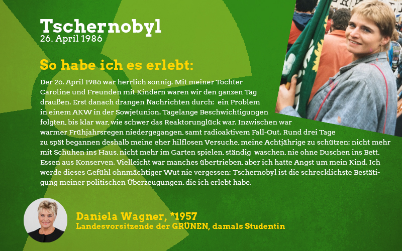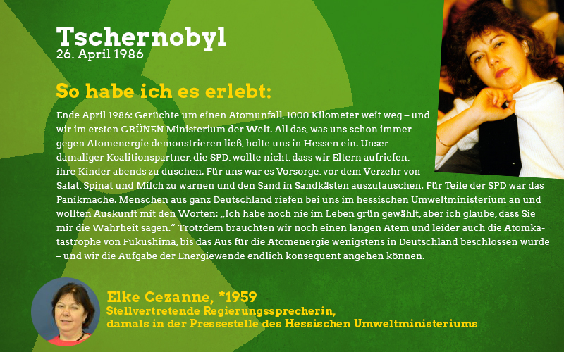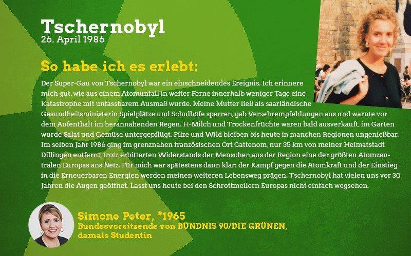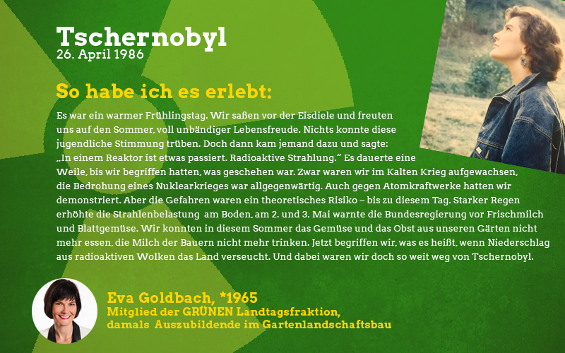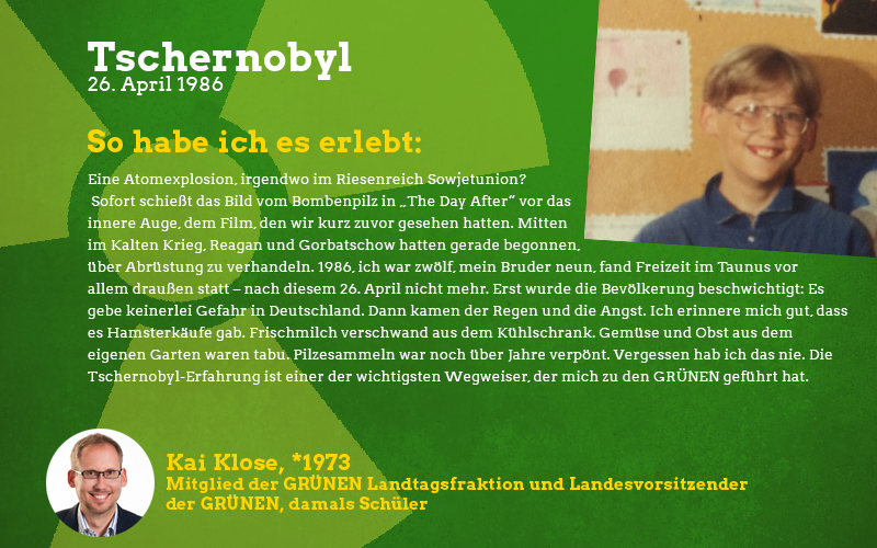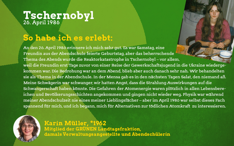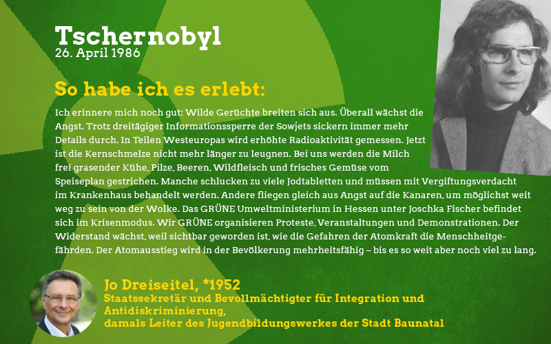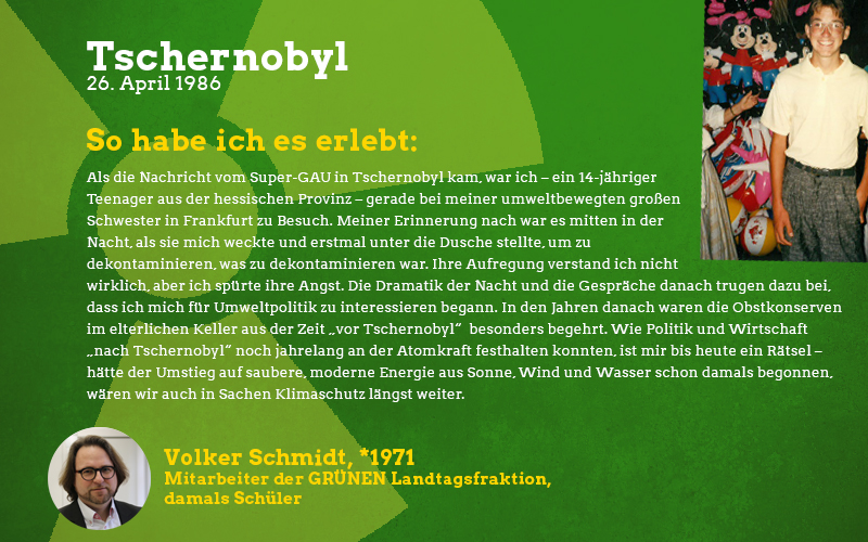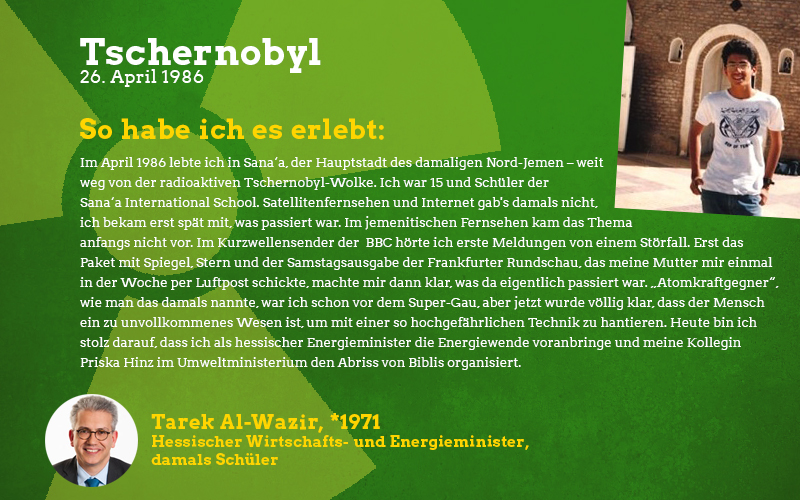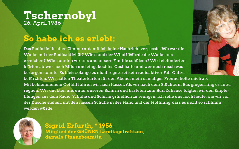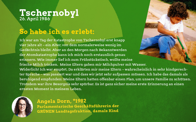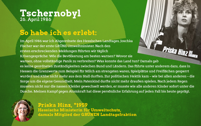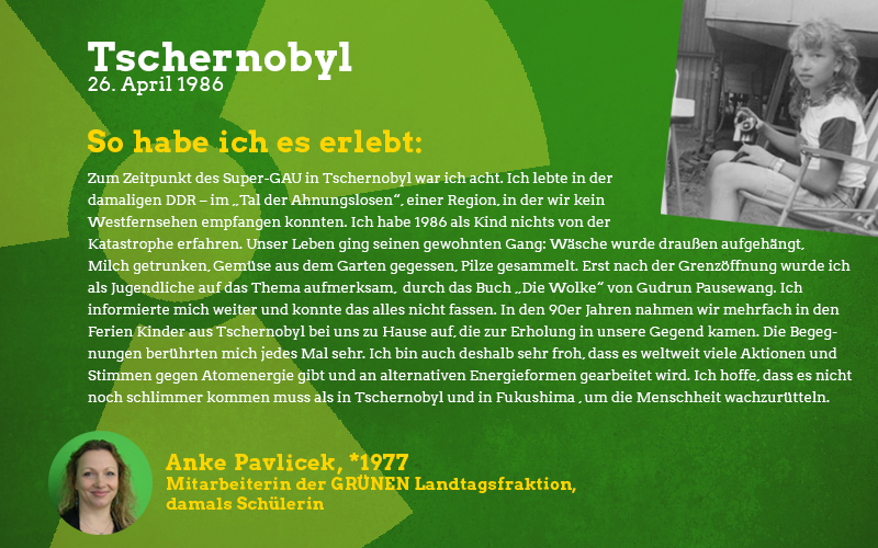 Aus der Perspektive eines damals fast sechsjährigen Mädchens: Im Frühjahr des Jahres 1986 sagte mir meine Mutter auf einmal, dass ich in den nächsten Wochen nicht mehr im Sandkasten und auf meinen Lieblingsspielplätzen spielen dürfte. Barfuß zu laufen war tabu und es gab vieles nicht zu essen, was sonst gerne den Weg zu uns auf den Tisch fand. Vor allem frisches und saisonales Gemüse blieb monatelang aus. Verstanden habe ich das als kleines Mädchen natürlich nicht aber ich wusste, dass etwas Schlimmes passiert sein musste und verspürte eine Angst in mir, die mich die Verbote meiner Mutter akzeptieren ließ. Die Erwachsenen waren in den Tagen und Wochen nach der Katastrophe sehr aufgeregt und man sprach oft über das nahegelegene Biblis, schließlich sei das ja alles sehr in der Nähe und nicht so weit weg wie man denken könnte. Die Stilllegung von Biblis im Jahre 2011 war lange überfällig, ich begrüßte sie als Erwachsene mit den erlebten Erinnerungen an die Nuklearkatastrophe sehr. Ich hoffe, dass wir den Weg der erneuerbaren Energien weitergehen und in diverse Technologien dieser Art wie z.B. piezoelektrische Bauteile in Straßen investieren.