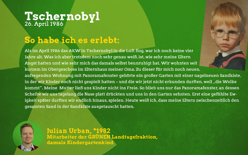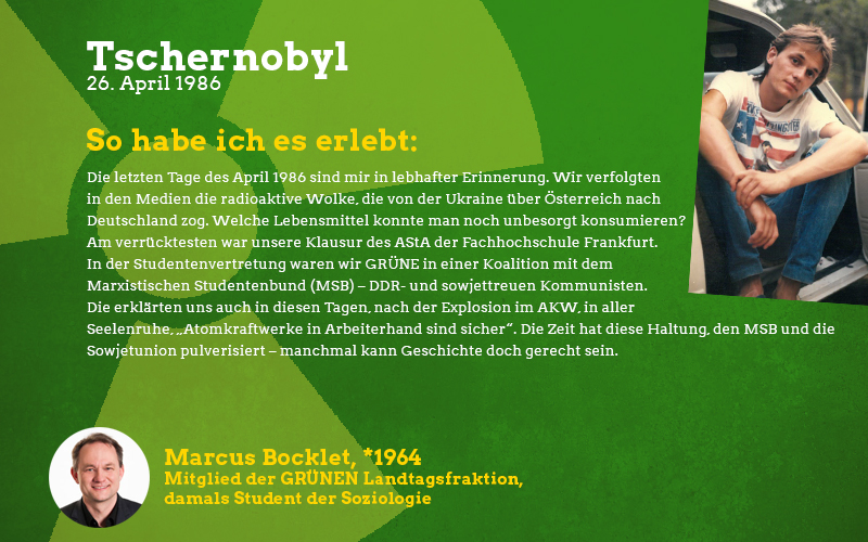 Im Alter von zwölf Jahren habe ich das, was bei uns über die öffentlich rechtlichen Sender ankam, in meinem kindlichen Unbedarftsein nur zunächst am Rande zur Kenntnis genommen. Am 1. Mai 1986, damals war ich Messdiener der örtlichen Pfarrei am Bodensee, haben wir einen Messdiener-Wanderausflug unternommen. Dabei soll wohl die radioaktive Wolke bereits über Süddeutschland angekommen sein. Uns hatte davor niemand gewarnt, leider. Einige Tage danach hatte man Spielplatz-Sandkästen abgesperrt, Sportplatzanlagen waren für den Sport unter freiem Himmel gesperrt. Zuhause mieden wir Salat und frühes Obst aus dem eigenen Garten; Pilze aus der freien Natur sowie Wildfleisch im Sommer und Herbst waren verboten. Als Kind habe ich auf Wiesen esstellergroße Wiesenchampignons entdeckt, diese waren steinhart und fühlten sich an wie Plastik.