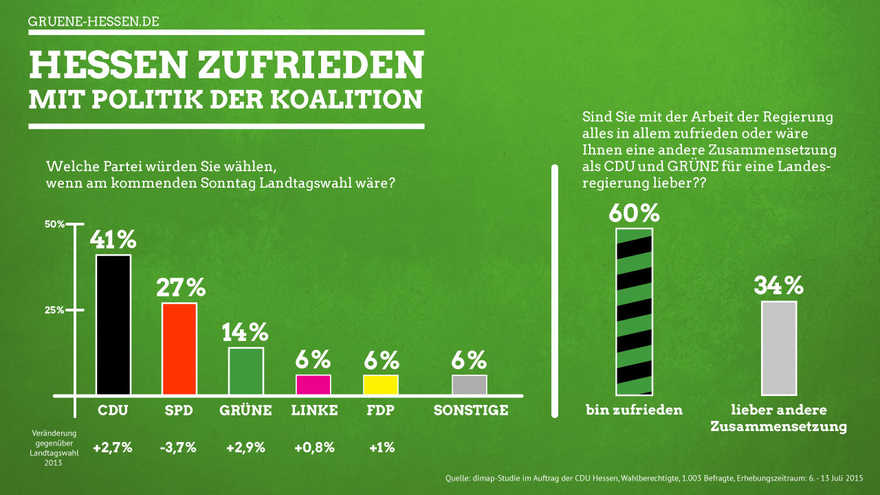 „Wir arbeiten als GRÜNE sachlich und praxisorientiert daran, unsere politischen Ziele durchzusetzen und die im Koalitionsvertrag mit der CDU vereinbarten Projekte voranzubringen. Umfragen sind keine Wahlen. Die repräsentativen Ergebnisse zeigen trotzdem deutlich, dass die auf Ergebnisse zielende Politik der Koalition bei den Bürgerinnen und Bürgern besser ankommt als lautstark und oft populistisch vorgetragene Parolen, hinter denen keine inhaltlichen Alternativen zu erkennen sind.“