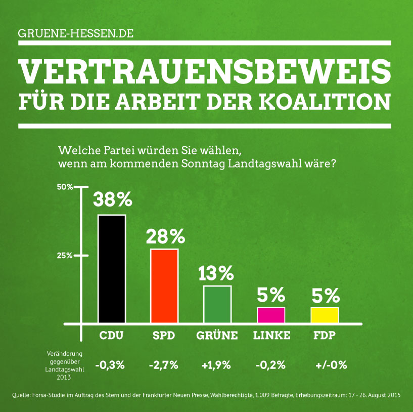 ngskoalition. „Seit der Landtagswahl 2013 hat die schwarz-grüne Landesregierung in allen Umfragen stets das Vertrauen der Hessinnen und Hessen ausgesprochen bekommen“, kommentieren die Landesvorsitzenden Daniela Wagner und Kai Klose, „so ist es auch dieses Mal. Dies ist ein deutlicher Vertrauensbeweis für die erfolgreiche Arbeit der Regierungskoalition.“
