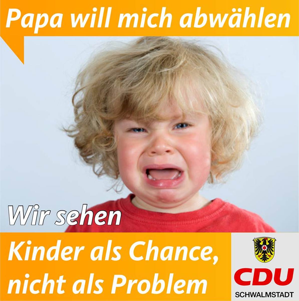 DIE GRÜNEN trauen auch dem von der CDU verkündeten Wahlkampffrieden nicht. „Hinter den Kulissen sieht die Lage ganz anders aus. Da gibt es Flugblätter der CDU Hessen zu Steuerplänen der GRÜNEN, die den Bürgerinnen und Bürgern mit nachweislich falschen Zahlen Angst einjagen sollen Und die CDU Schwalmstadt postet im Internet gegen Kita-Betreuung. Wir wollen wissen, ob der CDU-Landesverband hinter diesen Aktionen steht. Das ist doch etwas ganz anderes als die weichgespülte Kampagne, die der Generalsekretär heute vorgestellt hat“, sagt Klose. Die CDU Schwalmstadt zeigt im Internet unter der Überschrift „Papa will mich abwählen“ ein weinendes Kind, das offenbar nicht in die Kita will. (s. Foto)