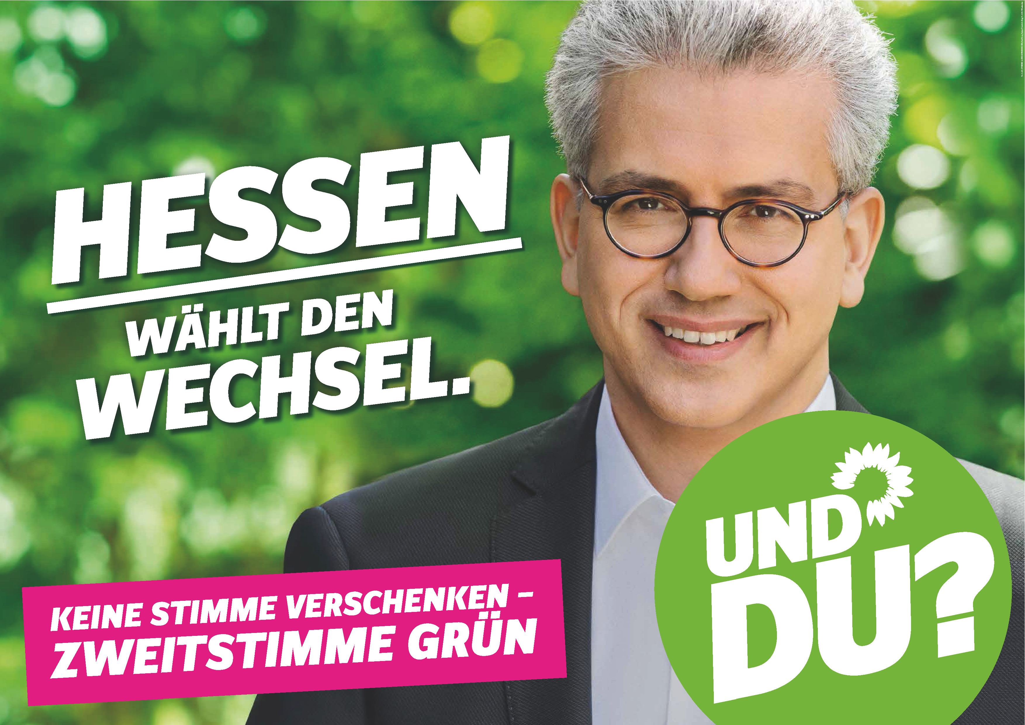 „Mit dieser Botschaft greifen wir nochmals die in Hessen vorhandene Wechselbereitschaft auf und unterstreichen die Unterschiede zum Bund: Die Hessinnen und Hessen haben nach 15 tristen Jahren genug von Schwarz-Gelb. Gleichzeitig geht Volker Bouffiers Rechnung nicht auf und es gelingt ihm nicht, sich im Windschatten von Angela Merkel durch die Wahl zu stehlen“, sagte Tarek Al-Wazir bei der Vorstellung des Motivs. „Wir haben die reale Möglichkeit in Hessen, die schwarz-gelbe Landesregierung abzulösen. Dafür braucht es starke GRÜNE. 15 Prozent plus X sonst wird es mit dem Wechsel nix“, bekräftigt der GRÜNE das Wahlziel seiner Partei.