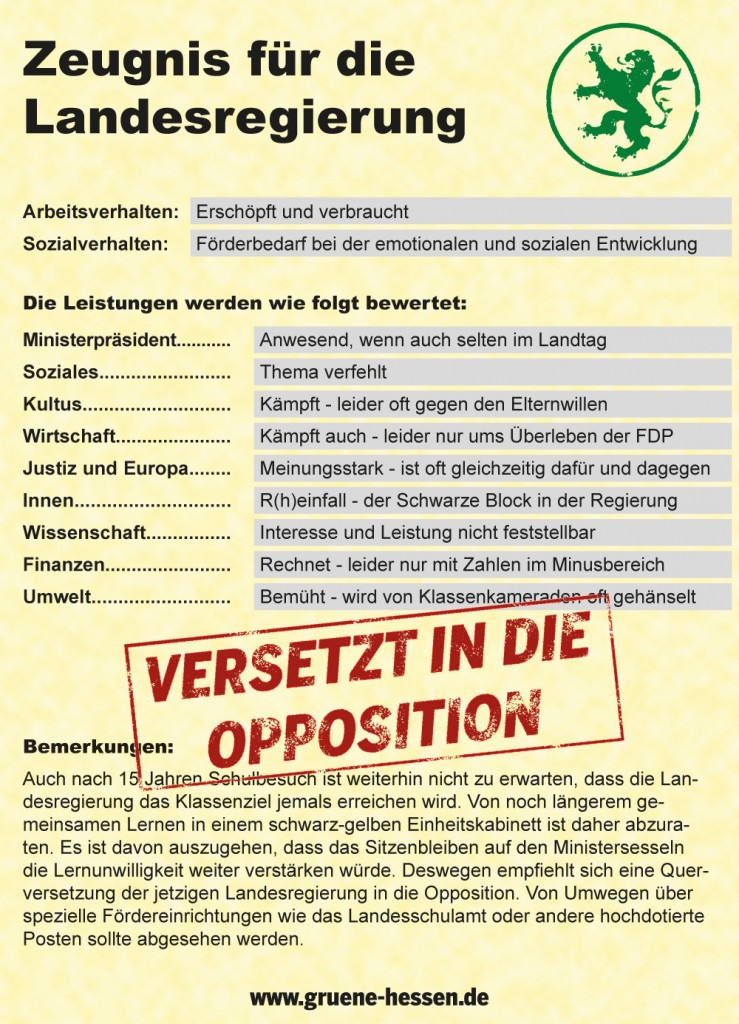 Mit ironisch-spitzen Bemerkungen nehmen die GRÜNEN die Leistungen des Ministerpräsidenten und seiner Ministerinnen und Minister aufs Korn (siehe Anlage). So wird beispielsweise Wissenschaftsministerin Kühne-Hörmann „Interesse und Leistung nicht feststellbar“ bescheinigt. Justizminister Hahn wird als „meinungsstark – ist oft gleichzeitig dafür und dagegen“ gewürdigt. Und die Leistungen des Innenministers werden als „R(h)einfall – der Schwarze Block in der Regierung“ beurteilt.